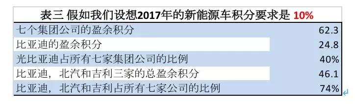 而假如我們?cè)O(shè)想2017年實(shí)行10%的新能源汽車積分政策,整個(gè)行業(yè)新能源車積分會(huì)有短缺。在表一中只有七個(gè)集團(tuán)公司有盈余積分。比亞迪可控制全部盈余積分的40%(圖三)。比亞迪、吉利和北汽集團(tuán)共占市場(chǎng)的74%!這三家企業(yè)會(huì)不會(huì),該不該成為歐佩克呢?
