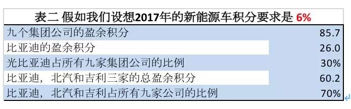 假如我們?cè)O(shè)想2017年實(shí)行6%的新能源汽車積分政策,在表一中共有9個(gè)集團(tuán)公司有盈余積分。比亞迪的盈余積分占可交易的全部盈余積分的30%。比亞迪、吉利和北汽集團(tuán)共占市場(chǎng)的70%(表二)。