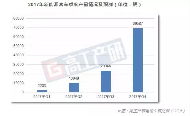 2017年上半年客車市場低迷,但在下半年實現(xiàn)了大的爆發(fā),尤其是四季度產(chǎn)量達到69587輛。2018年一季度客車市場依然會是全年最低迷的一個季度,但產(chǎn)量會高于2017年同期,GGII根據(jù)目前市場走勢來看,預計一季度產(chǎn)量會在1萬輛左右。