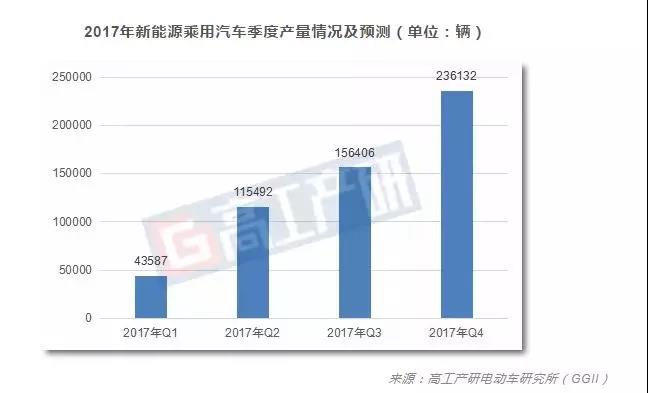 中國儲能網(wǎng)訊:從2017年,我國新能源汽車產(chǎn)量季度走勢來看,從一季度到四季度產(chǎn)量逐漸走高,其中第四季度產(chǎn)量更是接近一季度的近八倍。