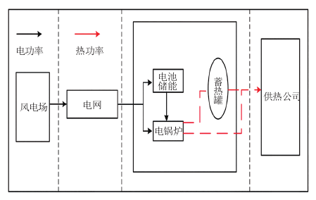 利用棄風電量進行電供熱是解決“三北”地區(qū)風問題的有效手段。夜間負荷低谷時段,利用谷電電或者協(xié)定的棄風電價對蓄熱式電鍋爐加熱,一方面向熱管網(wǎng)提供熱負荷,另一方面將多余熱能儲存至蓄罐中,以滿足次日電價高峰期的熱負荷要求。然而電爐的功率調(diào)節(jié)系統(tǒng)受機械部件制約,調(diào)節(jié)速率與風功快速波動不匹配,無法實現(xiàn)最大限度的消納風電。電學(xué)儲能具有電能雙向流動,有功、無功的靈活調(diào)節(jié)等點,其協(xié)調(diào)電鍋爐能夠改善其調(diào)節(jié)靈活性,具備跟蹤風功率的能力,提高風電供熱的經(jīng)濟性。
