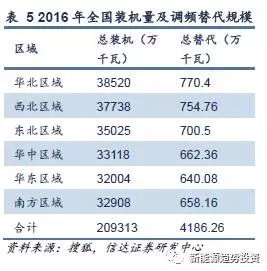 海外特別是歐洲及北美地區(qū),由于發(fā)達國家電改走在我們的前面,因此市場相對更成熟,調(diào)頻市場的需求也更強烈,如2014年歐洲總裝機量為14.11億千瓦,美國2016年裝機容量為11.84億千瓦,因此實際調(diào)頻市場規(guī)模預計分別可達到28.22GW、23.68GW。而從國內(nèi)來看,自2008年以來國內(nèi)裝機容量平均年增長率超過8%,我們認為未來5年裝機量平均增長率仍將保持這一速度,因此年新增裝機量將有約1.5億千瓦,由此我們得出年調(diào)頻需求在1.5~2GW左右(由于無法得知年實際峰值負荷,因此以裝機量近似代替)。