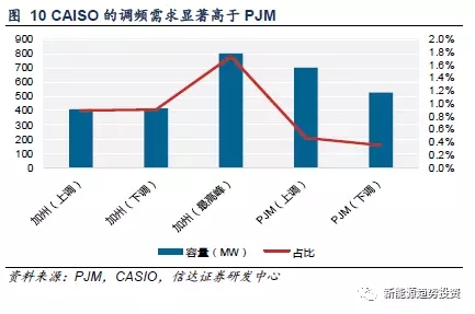 實際上隨著新能源的占比的不斷上升,實際需求還將會更高。以加州為例,由于風光的大量接入,2016年CAISO增加了2月~6月調(diào)頻需求量(一般增加到600MW,在2月底~3月初增加到800MW),總需求量是同期的近兩倍,而這段時間內(nèi)的調(diào)節(jié)成本同比上漲了6倍,這體現(xiàn)了調(diào)頻巨大的經(jīng)濟效益。2016年加州總裝機量達7902.6萬千瓦,其中風電占比7.1%,太陽能占比12.5%,相比之下PJM總裝機量達1.82億千瓦,而風電只占0.6%,太陽能占比只有0.1%。反應在調(diào)頻需求上加州的調(diào)頻需求是峰值容量的0.9%,最高峰時可達1.7%,而PJM只有0.3%~0.5%。