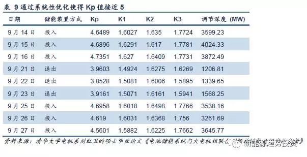 儲能參與AGC調(diào)頻效果顯著。在現(xiàn)有的政策及技術條件下,儲能由于無法作為獨立主體參與到市場中,因此目前儲能參與調(diào)頻市場的方式是與火電形成一個混合機組。根據(jù)華北區(qū)域的細則,理論上最好的調(diào)頻效果與最差的調(diào)頻效果之間可以相差近8000倍。實際應用中,投入前K2和K3的平均值分別在1.4和1.5左右,投入后上升到1.5和1.6左右,Kp值從2.98上升到3.2左右,后期通過進一步優(yōu)化使得Kp值提升到接近5,體現(xiàn)了儲能在調(diào)頻方面具有非常優(yōu)越的性能。