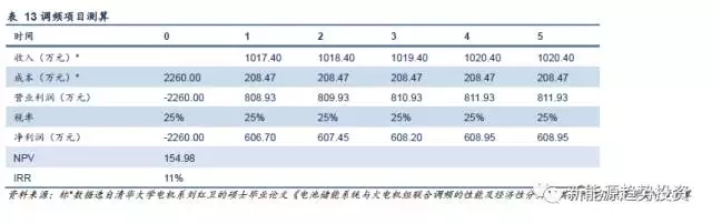 石景山項目總投資2260萬元,其中電池為1200萬元,PCS為600萬元,施工費用460萬元,我們假設設備殘值為5%,根據(jù)以上假設我們進行投資回收期測算,在第5年時NPV即可為正,IRR可達到11%,體現(xiàn)了調(diào)頻項目具有非常好的投資前景。