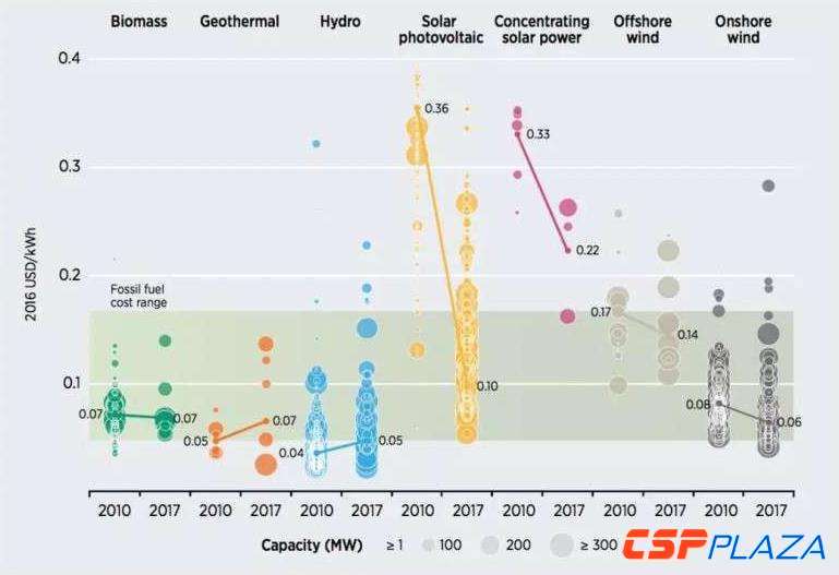 據(jù)報告介紹,海上風電和光熱發(fā)電雖然還處在發(fā)展初期,但2010年到2017年間,成本卻已呈現(xiàn)明顯下降趨勢。