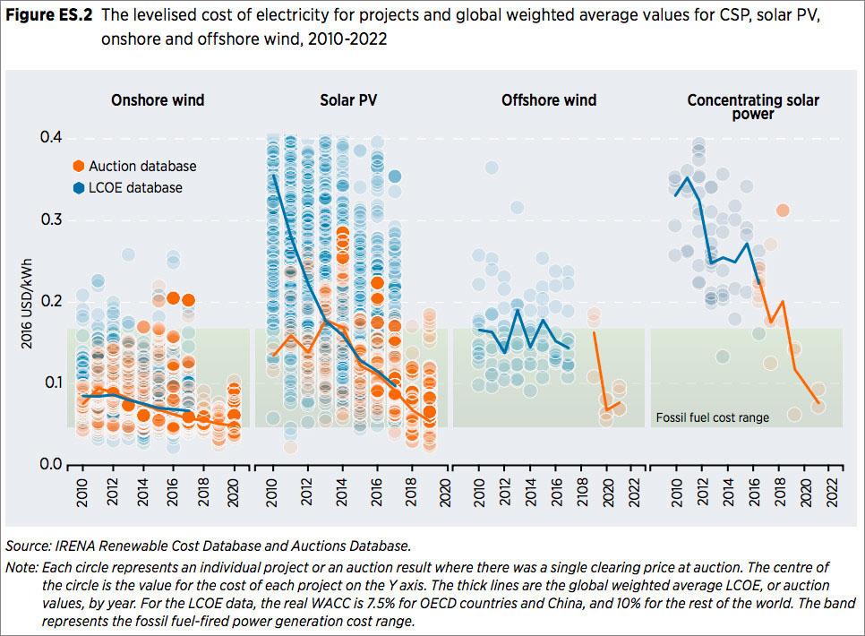 中國儲能網(wǎng)訊:近日,國際可再生能源署(IRENA)發(fā)布了《可再生能源發(fā)電成本報告》,披露了全球范圍內(nèi)2017年投運的生物質(zhì)發(fā)電、地熱發(fā)電、水電、陸上風電、海上風電、光熱發(fā)電、大型地面光伏的加權(quán)平準發(fā)電成本(LCOE,以2016年美元不變價格計算)。