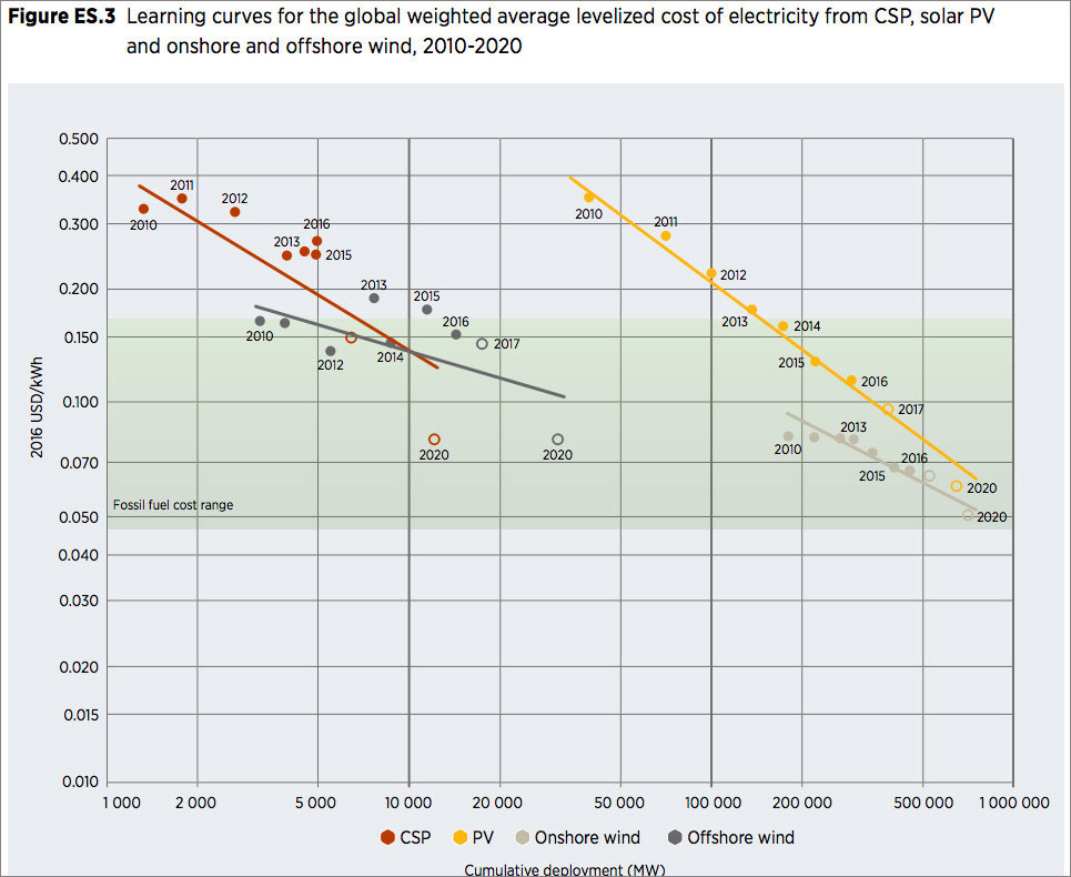 IRENA根據(jù)學習曲線模型估計,2010年到2020年期間,光熱發(fā)電的學習率有望達到30%(學習率,learning rate,學習曲線效應(yīng)的量化值,即裝機規(guī)模每翻一番,成本會隨之下降的百分比),而海上風電、陸上風電和光伏發(fā)電的學習率則分別為14%、21%和35%。