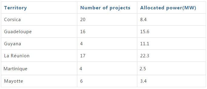 在法屬群島上可以清楚地看到這一點,在科西嘉島、瓜德羅普島和馬提尼克島等領(lǐng)土上的太陽能儲能項目招標(biāo)時,中標(biāo)者在2017年8月宣布,通常比以前的逆向拍賣低40%。包括光伏板和電池共計63.3MW的67個項目獲得了保證的購買價格,其發(fā)電功率為每MWh 113.6歐元(133.97美元)(表1)。