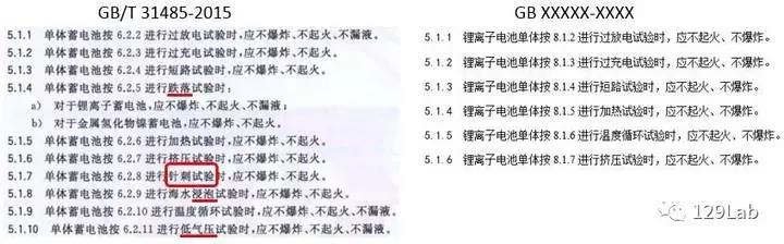 首先看一下GB單體電池的要求,過放、過充、短路、加熱、溫度循環(huán)、擠壓,一共五項安全測試,跟GB/T31485-2015的10項測試要求相比,減少了4項。其中,單體電池的針刺要求也在GB里面取消了。