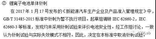 首先說一下準(zhǔn)入管理。在其附件3的新能源汽車產(chǎn)品專項檢驗項目及依據(jù)標(biāo)準(zhǔn)里面,的確說明“針刺試驗暫不執(zhí)行”,但是原因不明。另外這是暫時不執(zhí)行,為什么是“暫時”,不是“永久”?將來可能會恢復(fù)針刺測試嗎?原因也不明。這一條理由似乎有點讓人不知所以然。