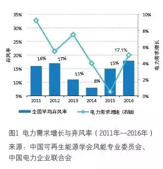 (1)2015 年,我國(guó)風(fēng)電占總發(fā)電量的3.3%。2016 年,總體發(fā)用電增長(zhǎng)5%,風(fēng)電發(fā)電增長(zhǎng)大約30%。就風(fēng)電在電源結(jié)構(gòu)中的份額,大約在4%左右。從最近幾年的變化來(lái)看(2011年—2016 年,見(jiàn)圖1),風(fēng)電棄風(fēng)率跟電力需求增長(zhǎng)之間,并不存在明確的相關(guān)(乃至因果)關(guān)系,而可能更多地受其他因素的影響(比如裝機(jī)地區(qū)結(jié)構(gòu)、氣候條件、其他電源安排、調(diào)度自由量裁等)。