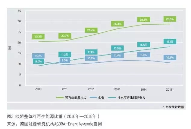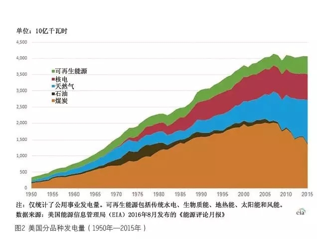 (2)2005 年—2015 年十年間,美國(guó)的風(fēng)電份額從幾乎可以忽略,上升到接近5%。同期, 其總用電量2015 年幾乎回到了2005 年的水平(見(jiàn)圖2)。電力需求已經(jīng)飽和,甚至略微下降。這是風(fēng)光等可再生能源快速在電力結(jié)構(gòu)中擴(kuò)大份額的機(jī)會(huì),而不是障礙。