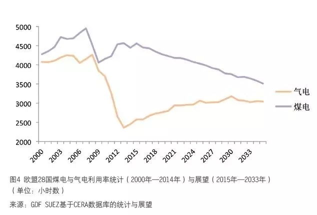 (3)2005 年—2015 年10 年間,歐盟的電力消費(fèi)保持穩(wěn)中有降的飽和趨勢(shì),2015 年相比2005 年下降1%。2015 年,非水可再生能源消費(fèi)比重接近20%( 見(jiàn)圖3), 其中風(fēng)電接近10%。丹麥、西班牙、葡萄牙以及德國(guó)等的非水可再生比重更是達(dá)到30%以上,而同期電力消費(fèi)明顯下降。由于電力批發(fā)市場(chǎng)價(jià)格持續(xù)下跌,碳市場(chǎng)價(jià)格不振,邊際成本較高的天然氣發(fā)電2009 年—2015 年幾乎被徹底擠出市場(chǎng)(見(jiàn)圖4),利用率大幅下降。在2016 年,由于廉價(jià)的天然氣(部分月份低過(guò)煤炭邊際成本)可得,這一趨勢(shì)反轉(zhuǎn),天然氣發(fā)電迅速反彈。