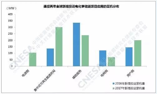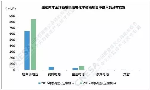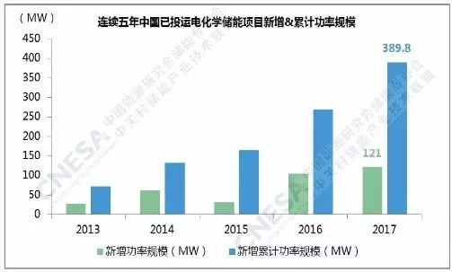 據(jù)儲能聯(lián)盟的不完全統(tǒng)計,截至2017年底,中國已投運儲能項目累計裝機規(guī)模為28.9GW。其中,抽水蓄能的累計裝機占比最大,接近99%,電化學(xué)儲能項目的累計裝機規(guī)模緊隨其后,為389.8MW,占比為1.3%,較上一年增長0.2個百分點。2017年,中國新增投運電化學(xué)儲能項目的功率規(guī)模為121MW,同比增速超過15%。