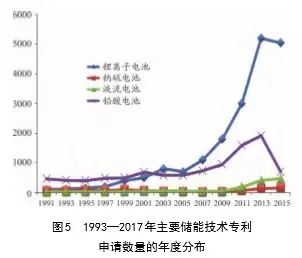 圖5為1993-2017年主要儲能關鍵技術專利申請數(shù)量年度變化圖,如圖所示,進入21世紀之前,鉛酸電池技術的專利產(chǎn)出明顯高于其他三種儲能技術,直到2003年被鋰離子電池超越。從年度專利變化來看,鋰離子電池的專利產(chǎn)出在2008年后開始大幅增長,專利數(shù)量遙遙領先其他電池技術,成為最熱儲能技術。