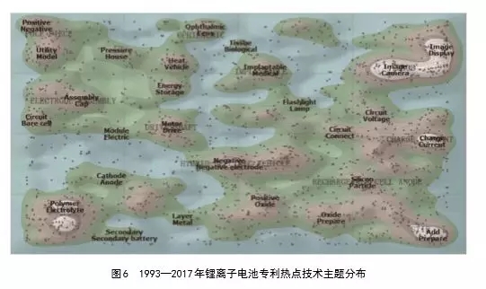 利用ThomsonInnovation平臺的專利地圖功能,結(jié)合專利分類號的分析,我們對鋰離子電池、鈉硫電池、液流電池及鉛酸電池專利技術熱點進行了分析。圖6為鋰離子電池的專利熱點技術地圖,可以看出,鋰離子電池專利的熱點技術主題包括:(1)聚合物電解質(zhì);(2)正極、負極氧化物材料研究;(3)儲能、電動汽車及圖像處理技術應用;(4)充放電研究;