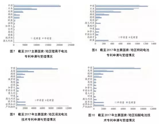 在鋰離子電池領域,中國、日本、美國、韓國、德國為主要專利產(chǎn)出國,其中中國專利申請量大幅領先(如圖7所示)。在鈉硫電池領域,日本專利數(shù)量處于絕對領先地位(如圖8所示);液流電池領域,中國、日本和美國三國專利占到全球申請總量的80%以上,中國排名首位(如圖9所示);鉛酸電池領域,日本、中國、美國三國的專利申請數(shù)量占全球申請總量的90%,日本排名首位(如圖10所示)。