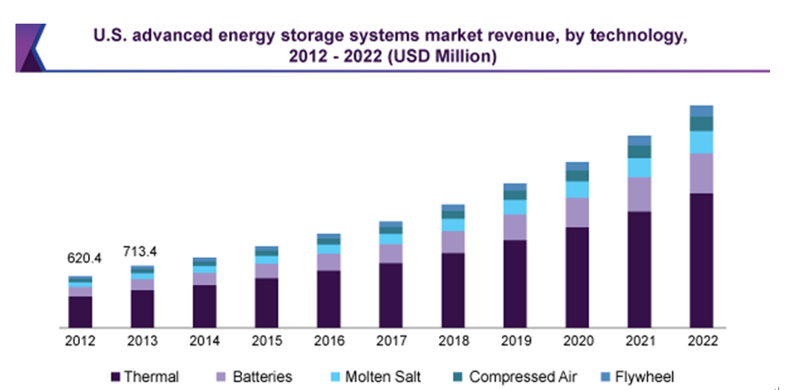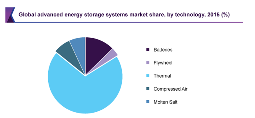 全球儲能系統(tǒng)市場可以按技術(shù)和地區(qū)分類。在技術(shù)方面,其進(jìn)一步細(xì)分為飛輪、壓縮空氣、熱儲能、蓄電池、熔鹽等儲能市場。熱儲能技術(shù)在2014年引領(lǐng)全球市場的發(fā)展,占產(chǎn)能總量份額的70.8%。由于高可靠性、高效率和更長的使用壽命,飛輪技術(shù)具有巨大的發(fā)展?jié)摿?。另一方面,蓄電池預(yù)計將成為增長最快的技術(shù)領(lǐng)域。預(yù)計到2022年,復(fù)合年增長率將達(dá)到近18%。