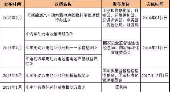 自2017年以來(lái),隨著動(dòng)力電池報(bào)廢潮小高峰日漸臨近,國(guó)家對(duì)于動(dòng)力電池回收利用管理也打出了組合拳。為規(guī)范行業(yè)操作以及后續(xù)政策制定做出了一定的參考標(biāo)準(zhǔn)。