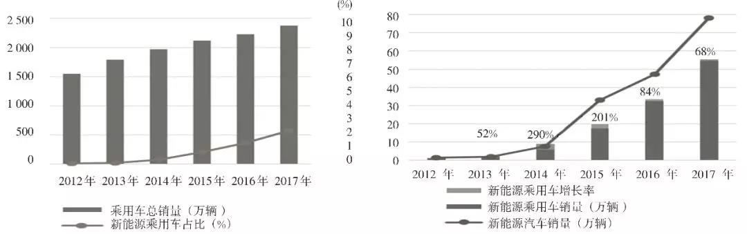 在全國(guó)整個(gè)乘用車銷售市場(chǎng)中,近年來(lái)傳統(tǒng)燃油乘用車的銷量穩(wěn)步增長(zhǎng),從 2012 年到 2017 年均增長(zhǎng)率為 9%。新能源乘用車在 2013~2015 年經(jīng)歷了爆發(fā)式增長(zhǎng),從 2012 年的銷量不足 1 萬(wàn)輛,到 2015 年的年銷量已經(jīng)超過(guò) 17 萬(wàn)輛,再到 2017 年全年銷量已接近 55 萬(wàn)輛。每年的增長(zhǎng)率都超過(guò) 50%。從銷量數(shù)據(jù)上來(lái)看,新能源乘用車銷量占全國(guó)乘用車銷售比例從 2012 年占比不足 0.7%,到 2017 年銷量超過(guò) 2.3%。(詳見圖 3)