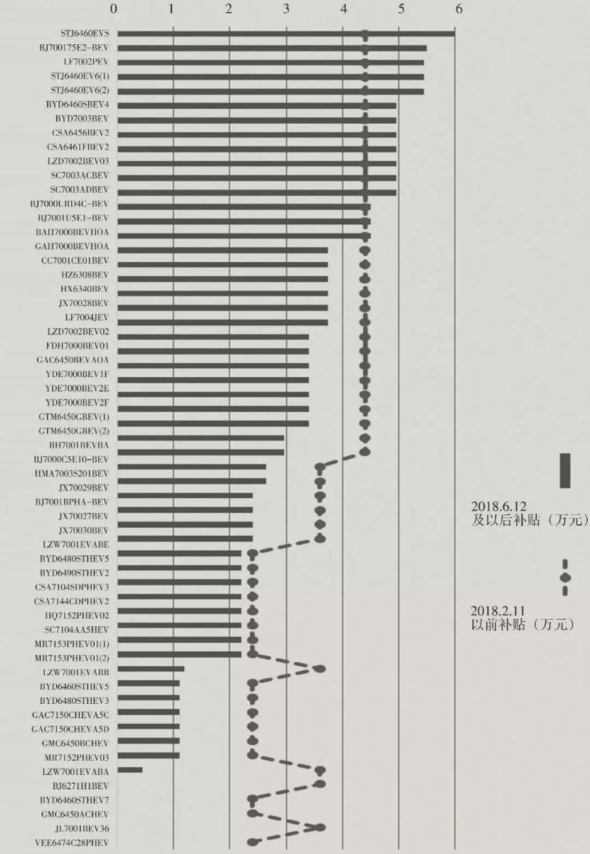 本文根據(jù)新規(guī)對(duì) 2018 年前兩批推薦新能源乘用車車型進(jìn)行試算,分析比對(duì)同一車型在 2018 年 2 月 12 日以前與 2018 年 6 月11 日以后的補(bǔ)貼變化。詳見圖 1,左側(cè)縱軸顯示車型,上方橫軸 0~6 為單車補(bǔ)貼金額(單位:萬(wàn)元)。