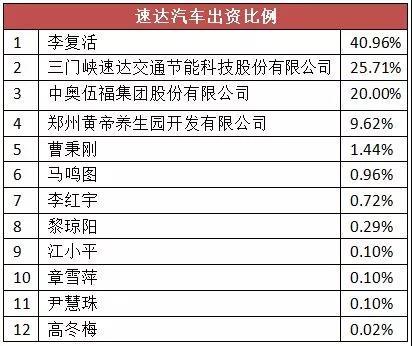 目前的工商信息顯示,速達(dá)汽車董事長李復(fù)活持有超4成股權(quán)。而第二大股東三門峽速達(dá)交通節(jié)能科技股份有限公司(速達(dá)科技,新三板上市公司),也是李復(fù)活實(shí)際控制的公司,持有近四分之一股份。兩項(xiàng)相加,李復(fù)活持有近65%股份。