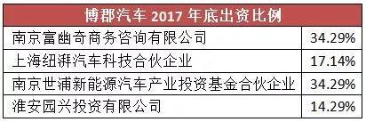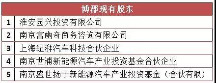 據(jù)南京日?qǐng)?bào)報(bào)道,2016年12月22日,由中科招商投資管理集團(tuán)股份有限公司與浦口經(jīng)濟(jì)開發(fā)區(qū)共同發(fā)起、總規(guī)模達(dá)50億元人民幣的南京浦口新能源汽車產(chǎn)業(yè)基金揭牌。中科招商是博郡汽車最早投資者,和南京浦口對(duì)接之后,雙方一起孵化博郡。該基金即投資博郡汽車。從2017年底的工商信息看,南京世浦新能源汽車產(chǎn)業(yè)投資基金合伙企業(yè)占有34.29%的股份。