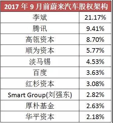 蔚來汽車公開對(duì)外的公司是上海蔚來汽車有限公司,但該公司由設(shè)在開曼群島的NIO NEXTEV LIMITED 100%控股,因此很難查到詳細(xì)投資信息。根據(jù)一份2017年9月的融資文件,蔚來汽車的出資方多且分散,經(jīng)過六七輪、總?cè)谫Y已經(jīng)超過150億元,至今股東超50家。