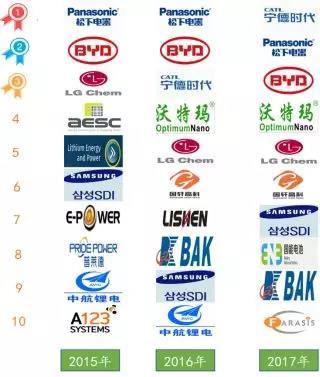 2015-2017年全球動(dòng)力電池銷量前十企業(yè)