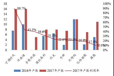 2016-2017年中國(guó)主要電池企業(yè)產(chǎn)能(GWh)及產(chǎn)能利用率