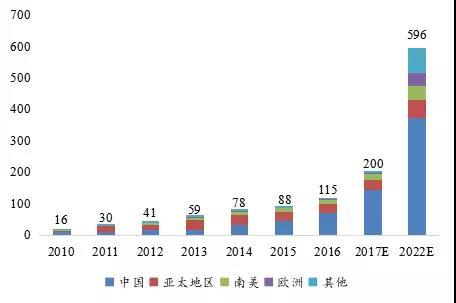 各區(qū)域電動(dòng)汽車和儲(chǔ)能鋰離子電池產(chǎn)能情況(GWh)
