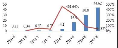 2010-2017年中國(guó)動(dòng)力鋰電池產(chǎn)量(GWh)及同比增速