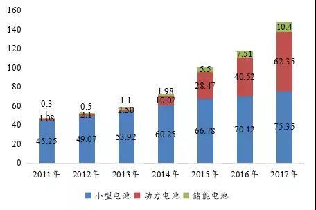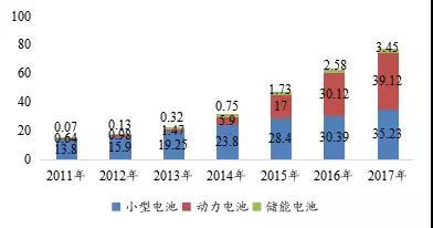 2011-2017年全球不同類型鋰電池出貨量(GWh)