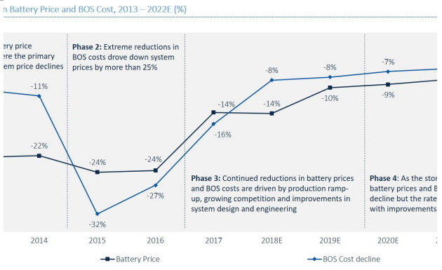 這個(gè)調(diào)查報(bào)告預(yù)測(cè),到2022年,電池儲(chǔ)能系統(tǒng)價(jià)格將以每年8%的速度下降。而2015-2016年期間,電池價(jià)格下降幅度高達(dá)32%,光伏平衡系統(tǒng)(BOS)的成本下降幅度高達(dá)24%。