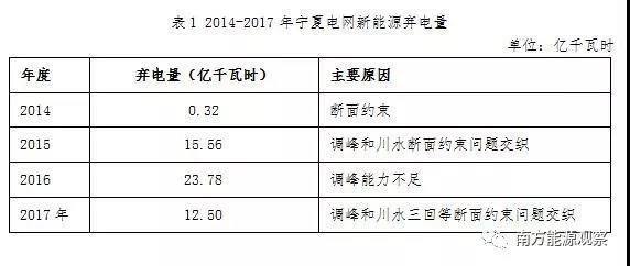 2014年5月寧夏電網(wǎng)首次出現(xiàn)電網(wǎng)斷面引起的新能源棄風(fēng),全年棄風(fēng)電量0.32億千瓦時(shí),棄電率0.49%。進(jìn)入2015年后,因新能源裝機(jī)超過了電網(wǎng)的全額接納能力,3月份首次出現(xiàn)因調(diào)峰能力不足的棄風(fēng),9月份首次出現(xiàn)棄光,調(diào)峰和斷面棄電問題交織,全年棄電15.56億千瓦時(shí),棄電率11.84%。2016年棄風(fēng)棄光成為電網(wǎng)運(yùn)行新常態(tài),全年棄風(fēng)棄光23.78億千瓦時(shí),棄電率11.61%。