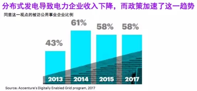埃森哲近期一項全球調(diào)研顯示,有58% 的公用事業(yè)企業(yè)認(rèn)為分布式發(fā)電將使本企業(yè)收入下降,44% 的公用事業(yè)企業(yè)認(rèn)為微電網(wǎng)會影響本企業(yè)收入 。尤其在亞太地區(qū),傳統(tǒng)企業(yè)對分布式能源的這種抵觸情緒更強(qiáng)烈。