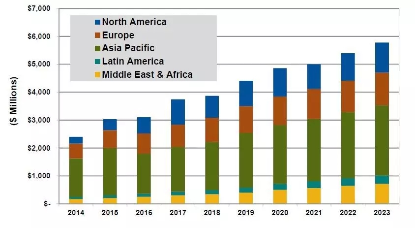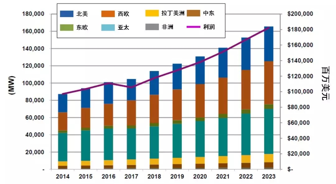根據(jù)Navigant Research的研究,全球分布式電源容量2023年將達到16550萬千瓦。其中,北美、西歐和亞太地區(qū)將是領(lǐng)頭軍,尤其是亞太地區(qū),占比達到32%(5230萬千瓦)。