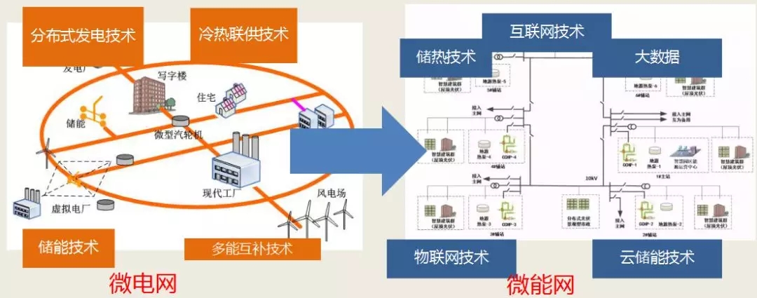 目前的微電網(wǎng)系統(tǒng)由分布式發(fā)電、冷熱電三聯(lián)供、儲能、多能互補等技術(shù)組成,后續(xù)將向由互聯(lián)網(wǎng)、大數(shù)據(jù)、云儲能、物聯(lián)網(wǎng)和儲熱技術(shù)組成的微能網(wǎng)方向發(fā)展。