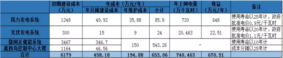 風(fēng)力發(fā)電系統(tǒng)由華儀公司投資,約1248萬元;光伏發(fā)電系統(tǒng)由正泰公司投資,約300萬元。因此,鹿西微網(wǎng)初期建設(shè)總體投資金額6179萬元。