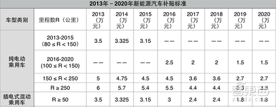 其中2013年-2020年新能源乘用車的補貼標準如下圖。