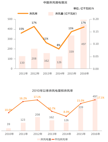 棄風(fēng)限電是我國(guó)風(fēng)電行業(yè)難以克服的一塊沉疴舊疾,也是一直困擾我國(guó)風(fēng)電發(fā)展的核心問(wèn)題。2015年,我國(guó)棄風(fēng)限電問(wèn)題反彈,并有進(jìn)一步惡化之勢(shì)。數(shù)據(jù)顯示,2016年全年風(fēng)電棄風(fēng)電量497億千瓦時(shí),同比增加158億千瓦時(shí);平均棄風(fēng)率17%,同比上升2個(gè)百分點(diǎn)。按平均電價(jià)0.5元/千瓦時(shí)計(jì)算,2016年損失電量收益近250億元。