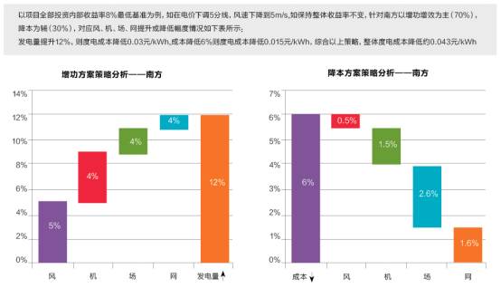 針對(duì)北方風(fēng)電場(chǎng)和南方風(fēng)電場(chǎng)的不同特點(diǎn),曹志剛給出了具體的破局路徑:北方項(xiàng)目應(yīng)以降本為主,“通過(guò)擴(kuò)大項(xiàng)目規(guī)模,共用升壓站、接入送出系統(tǒng)、場(chǎng)內(nèi)道路等來(lái)拉低項(xiàng)目初始投資。”南方項(xiàng)目應(yīng)以提高發(fā)電量為主,“在目前電價(jià)情況下,成本降低1%對(duì)IRR影響約0.25%~0.34%,發(fā)電量增加1%對(duì)IRR影響約0.58%~0.74%,成本與發(fā)電量對(duì)IRR的貢獻(xiàn)影響比約為3:7?!?