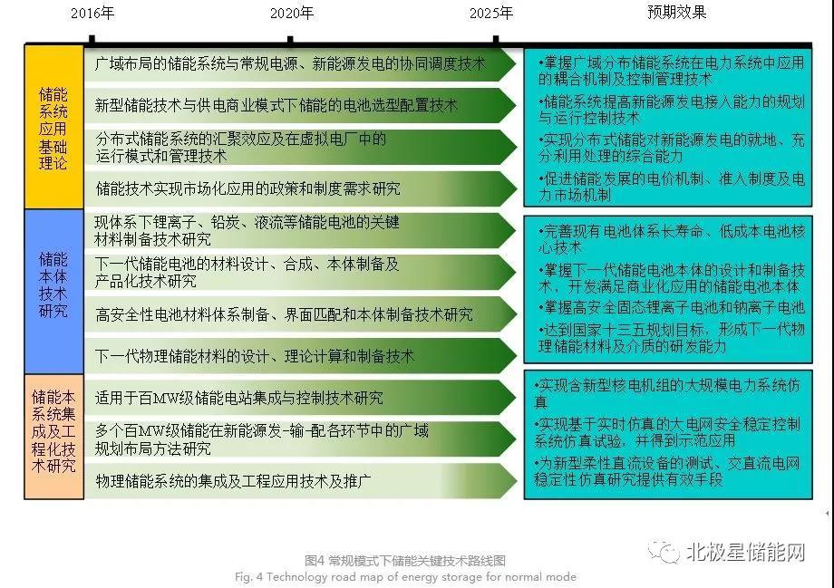 如圖4所示,常規(guī)模式技術(shù)路線下,全面掌握戰(zhàn)略布局的先進(jìn)儲能技術(shù),重點攻關(guān)化學(xué)儲能、壓縮空氣儲能、高溫儲熱的材料制備和核心裝置制造技術(shù)。突破儲能系統(tǒng)集成和能量管理等關(guān)鍵技術(shù),實現(xiàn)不同場景不同規(guī)模的示范驗證和推廣應(yīng)用。構(gòu)建完備的儲能技術(shù)標(biāo)準(zhǔn)體系,形成相對完善的產(chǎn)業(yè)鏈結(jié)構(gòu)。