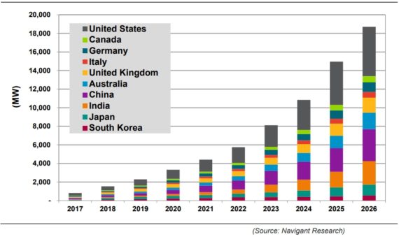Navigant Research預(yù)測(cè),2017年5個(gè)國(guó)家預(yù)計(jì)占全球新增儲(chǔ)能容量的51%,分別是美國(guó)、中國(guó)、印度、英國(guó)和澳大利亞。