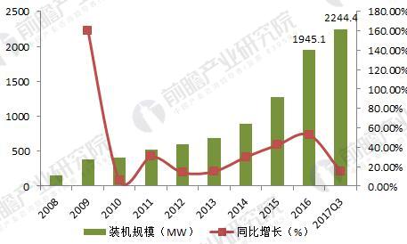 圖表2:2008-2017年全球電化學(xué)儲能項(xiàng)目累計(jì)裝機(jī)規(guī)模(單位:MW,%)