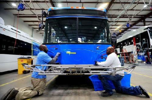 5月1日,在位于美國(guó)加州洛杉磯縣蘭開(kāi)斯特市的比亞迪工廠,工人在總裝車間工作。