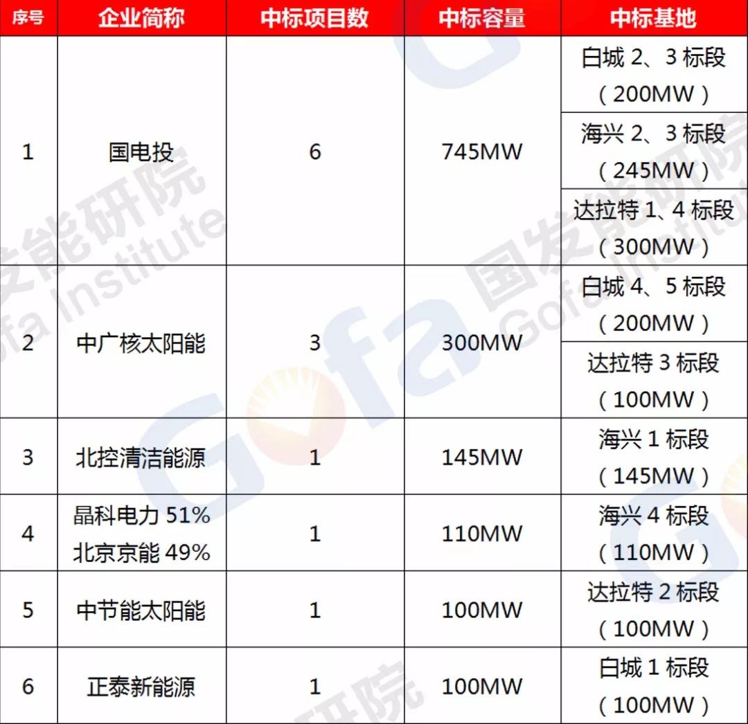 截止目前,國電投在白城、達(dá)拉特和海興三個(gè)應(yīng)用領(lǐng)跑基地都分別中標(biāo)兩個(gè)項(xiàng)目,以最大中標(biāo)容量領(lǐng)跑所有企業(yè)。其次中廣核太陽能共中標(biāo)3個(gè)項(xiàng)目,中標(biāo)容量300MW。預(yù)計(jì)上述兩家企業(yè)還會(huì)在即將公布的幾個(gè)基地中繼續(xù)拿下較多項(xiàng)目。