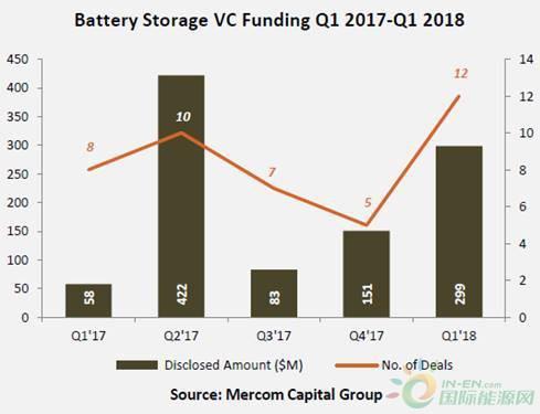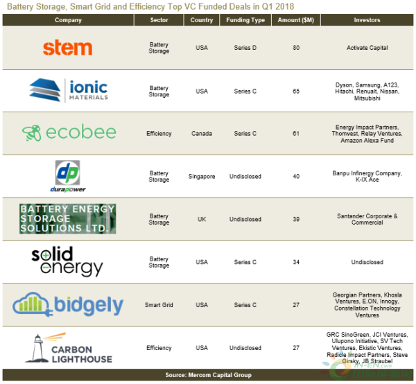Mercom Capital今天發(fā)布了其關于電池、智能電網和能效融資的季度報告。該報告發(fā)現,在2018年第一季度,電池公司的風險資本投資同比增長5倍,達到2.99億美元。這2.99億美元是儲能電池公司12輪的風險融資資金。其中最主要的是電池集成商Stem,它在D輪融資從Activate Capital獲得了8000萬美元的啟動資金。