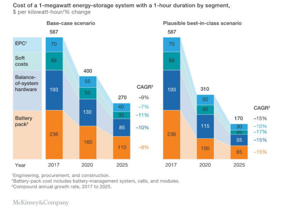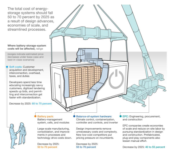 在過(guò)去五年中,有幾個(gè)因素導(dǎo)致儲(chǔ)能系統(tǒng)的成本全面下降。全球?qū)οM(fèi)電子產(chǎn)品和電動(dòng)汽車的需求刺激了對(duì)電池技術(shù)的投資,從而降低了每個(gè)組件的單位成本。同時(shí),由于制造業(yè)和供應(yīng)鏈管理的設(shè)計(jì)進(jìn)步和效率提高,其他硬件如逆變器、容器和氣候控制設(shè)備的成本變得更低。隨著企業(yè)積累經(jīng)驗(yàn)并簡(jiǎn)化流程,“軟”成本(客戶獲取,許可和互連等)以及工程、采購(gòu)和施工(EPC)成本下降。